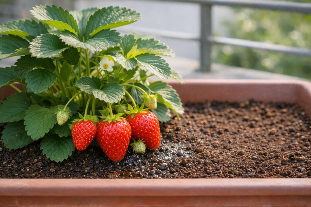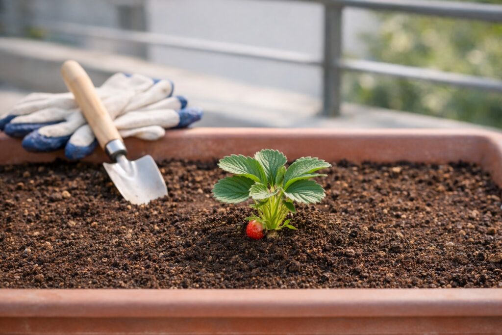 プランター栽培の場合は、根がしっかり張れるように深さ15cm以上の容器を選び、水はけの良い培養土を使用します。特にベランダ栽培では排水性が悪いと根腐れの原因になるため、鉢底石を敷くと安心です。地植えの場合は、植え付け前に土づくりを行い、苦土石灰などで土壌を弱酸性(pH5.5〜6.5)に調整しておくことで、いちごが育ちやすい環境を整えられます。