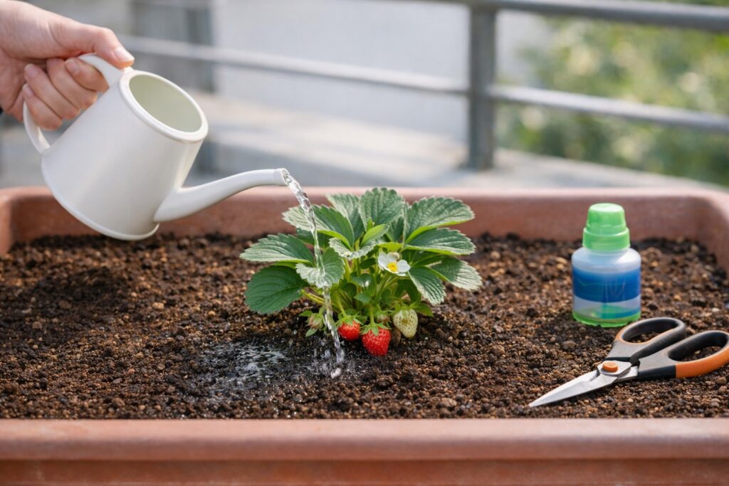 いちごは乾燥と過湿のどちらにも弱い、やや管理に注意が必要な植物です。水やりの基本は「土の表面が乾いたらたっぷり水を与える」ことですが、常に湿った状態にすると根腐れの原因になります。