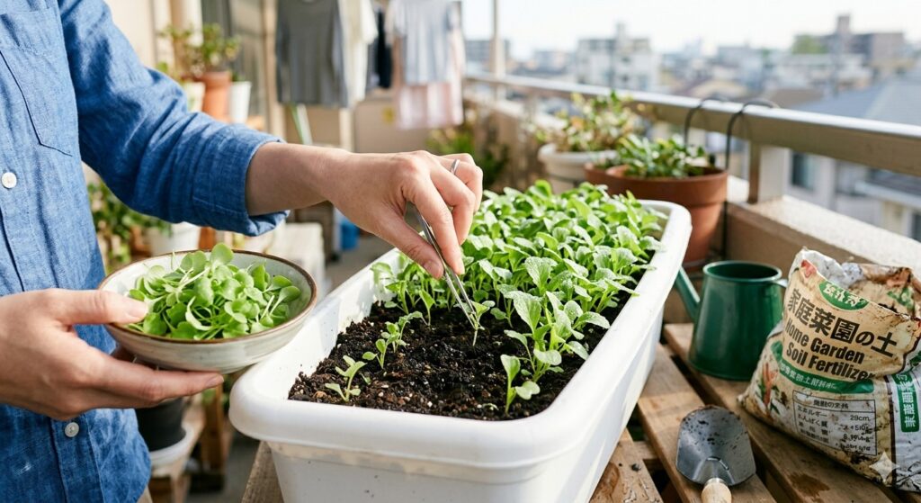 追肥は1回目の間引きが終わった1週間後から。2週間に1回程度、化成肥料を少量与えましょう。『ちなみに、間引いた若芽は「ベビーリーフ」としてサラダや味噌汁の具に活用できます。採れたての柔らかさを味わえるのは家庭菜園ならではの楽しみですよ。』