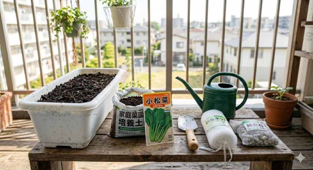 プランターと土: 深さ15〜20cm以上の容器と、清潔な「野菜用培養土」を用意する。