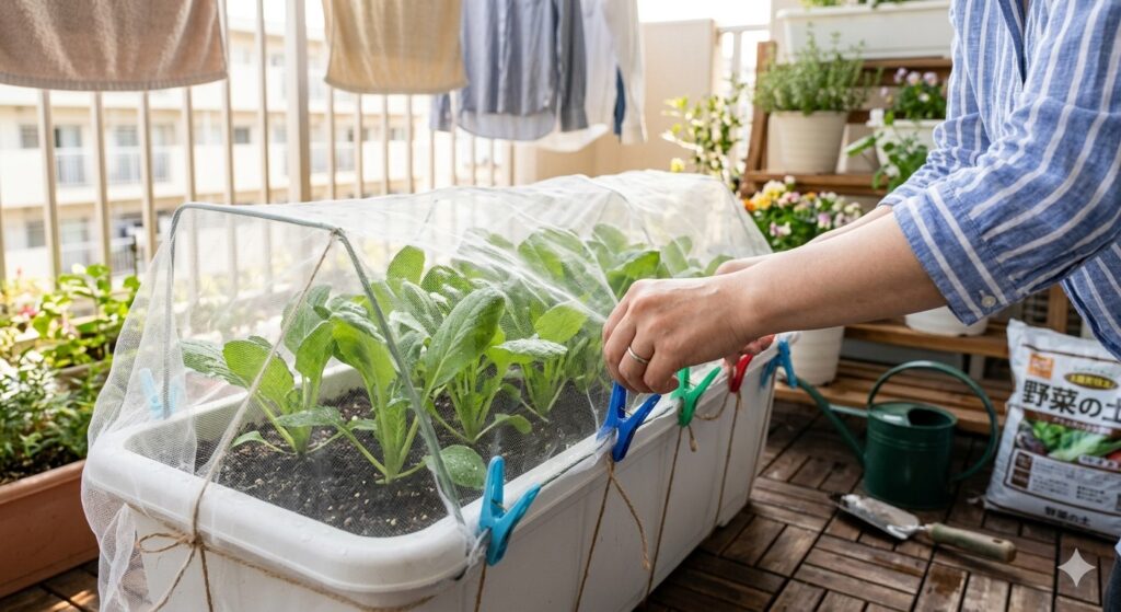 小松菜にはアブラムシやコナガがつきやすいため、すぐに防虫ネットを被せてください。『ネットを被せる際は、裾の部分とプランターの間に隙間ができないよう、紐や洗濯バサミでしっかり固定するのがコツです。ほんの少しの隙間からでも小さな虫は侵入してくるため、足元を固めることが鉄則です。』