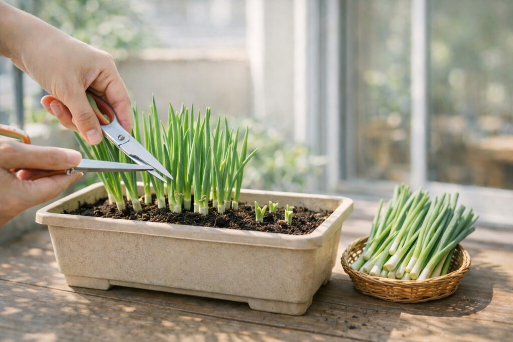 草丈が20cmほどになったら収穫できます。葉がやわらかく風味もよい時期なので、料理にも使いやすくおすすめのタイミングです。根元を2〜3cmほど残して切ると再び伸びてきます。切りすぎないように少し残しておくことで、株への負担を減らしながら長く収穫を楽しめます。