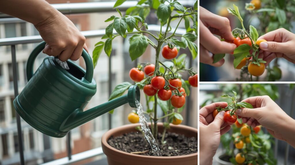 ミニトマトの葉が黄色くなる原因の中でも、水分管理の問題は最も頻繁に見られるトラブルのひとつです。特に初心者の方は、水やりの加減が難しく、つい過剰になったり不足したりすることが多いため注意が必要です。水を与えすぎると、鉢やプランター内の土が常に湿った状態となり、根に必要な酸素が行き渡らなくなってしまいます。その結果、根が酸欠状態に陥り、徐々に機能を失って最終的には根腐れを起こしやすくなります。根腐れを起こしたミニトマトは水や養分を吸収できなくなり、葉に十分な栄養が行き渡らなくなるため、下葉から黄変して枯れていく傾向があります。一方で、水分が不足しても植物はストレスを受け、まず葉先が乾燥してチリチリになり、最終的には全体が黄色く変色してしまいます。このように、与えすぎても不足しても葉の黄変を招くため、水分管理は非常に重要です。理想的な水やりのタイミングは「土の表面がしっかり乾いたのを確認してから、朝の時間帯にたっぷりと与える」ことです。朝に水をやることで、日中にしっかり吸収され、気温の高い時間帯にも蒸散がスムーズに行われます。また、鉢底から余分な水が流れる構造を確認し、根が長時間水に浸かってしまうことを防ぐことも忘れないようにしましょう。