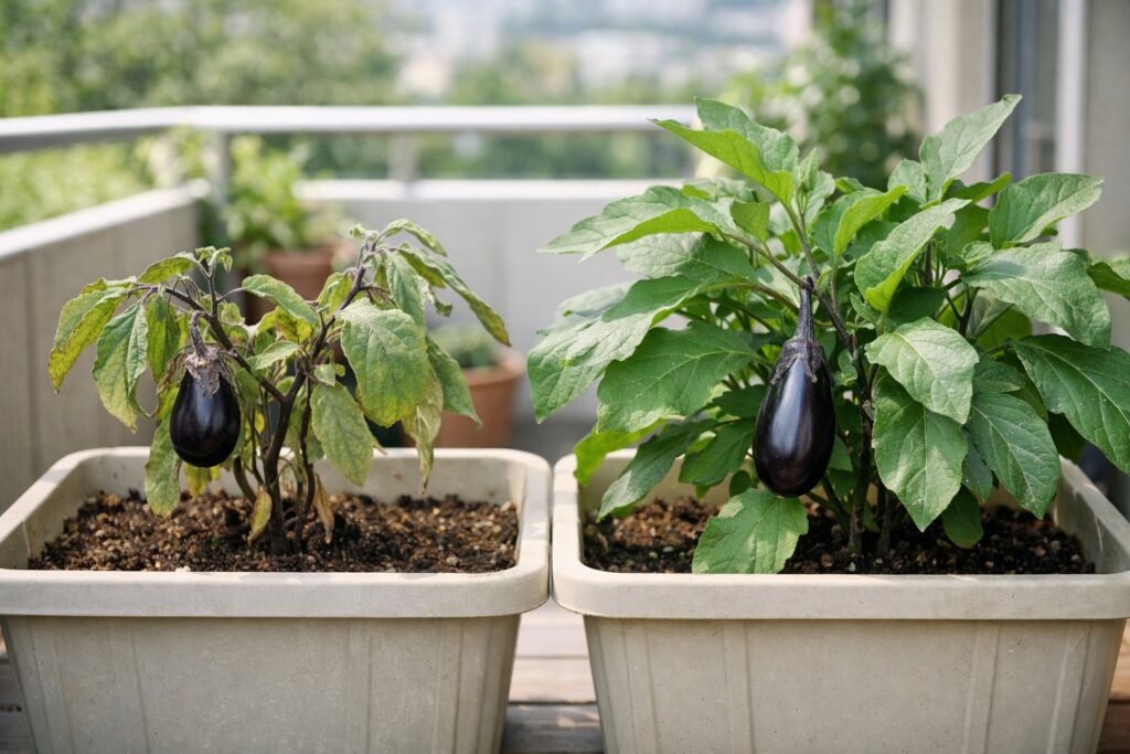 ナスは実を付けるたびに体力を消耗し、プランターは環境の変化(乾燥・肥料切れ)が早いからです。逆に言うと、少しのズレに早く気づければ、簡単に立て直せます。