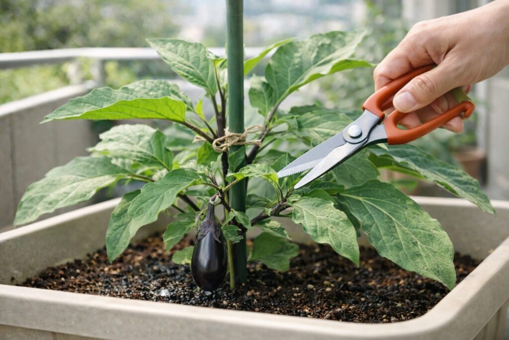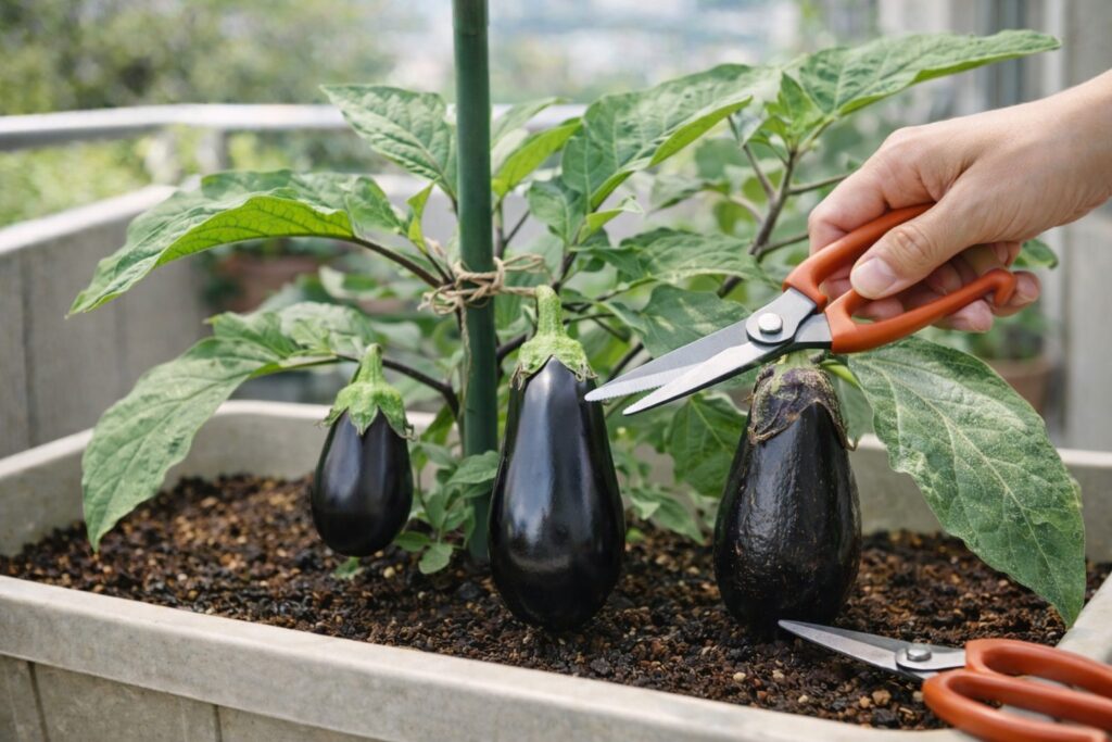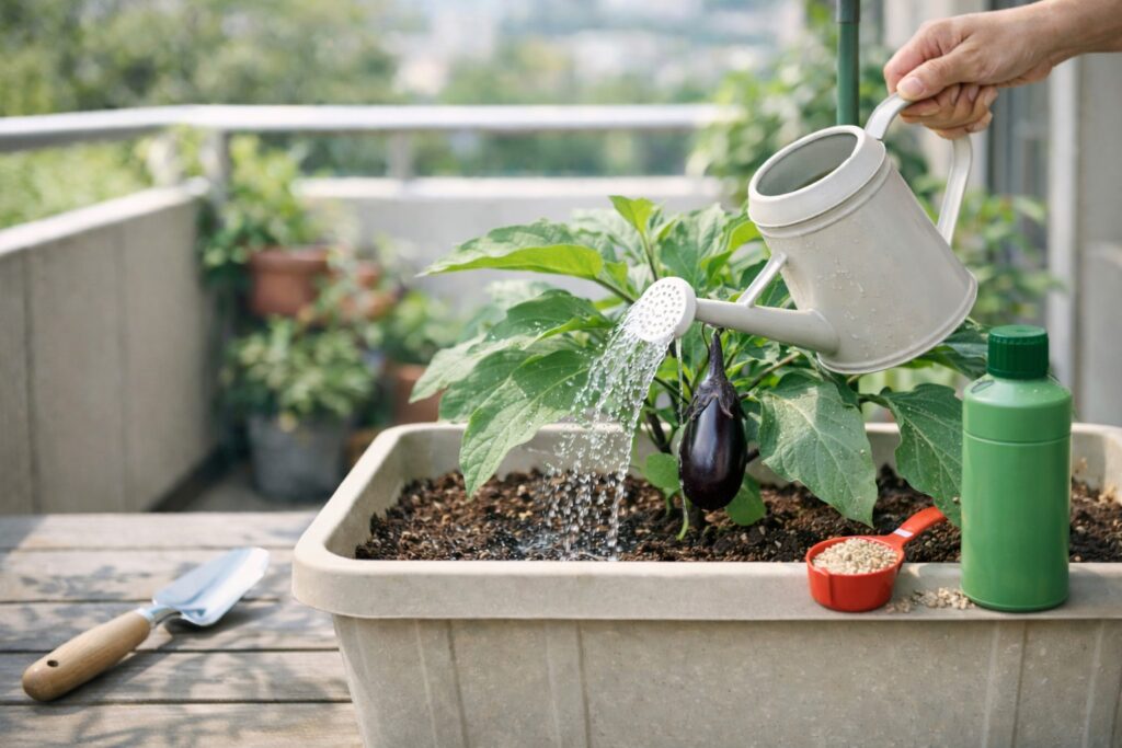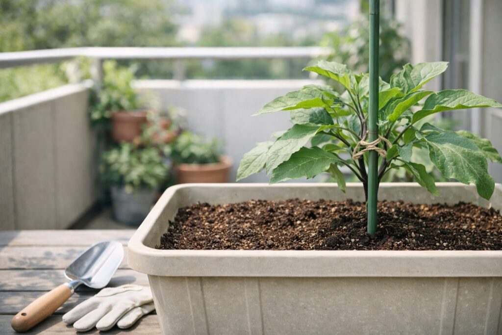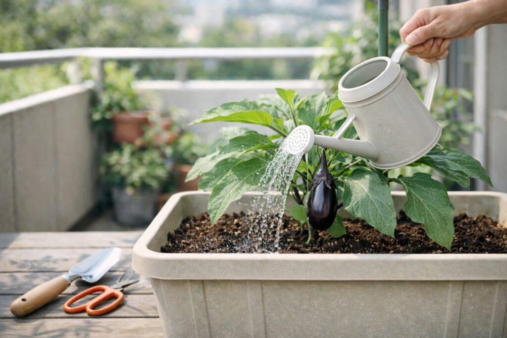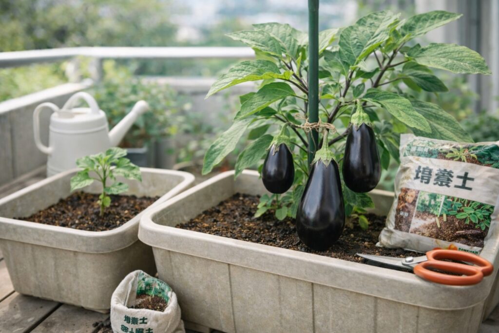 ナスのプランター栽培は、毎日の「観察」と「小さな手入れ」で収穫が伸びます。 水・肥料・風通しの3点を回し続ける ことです。