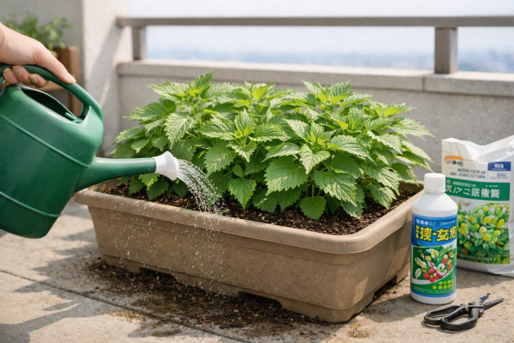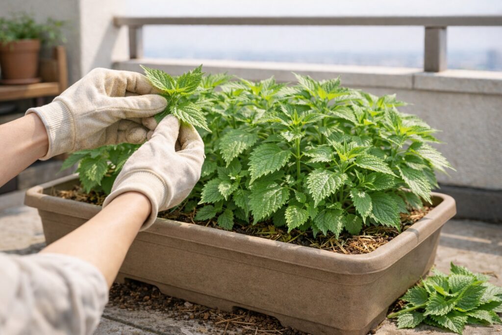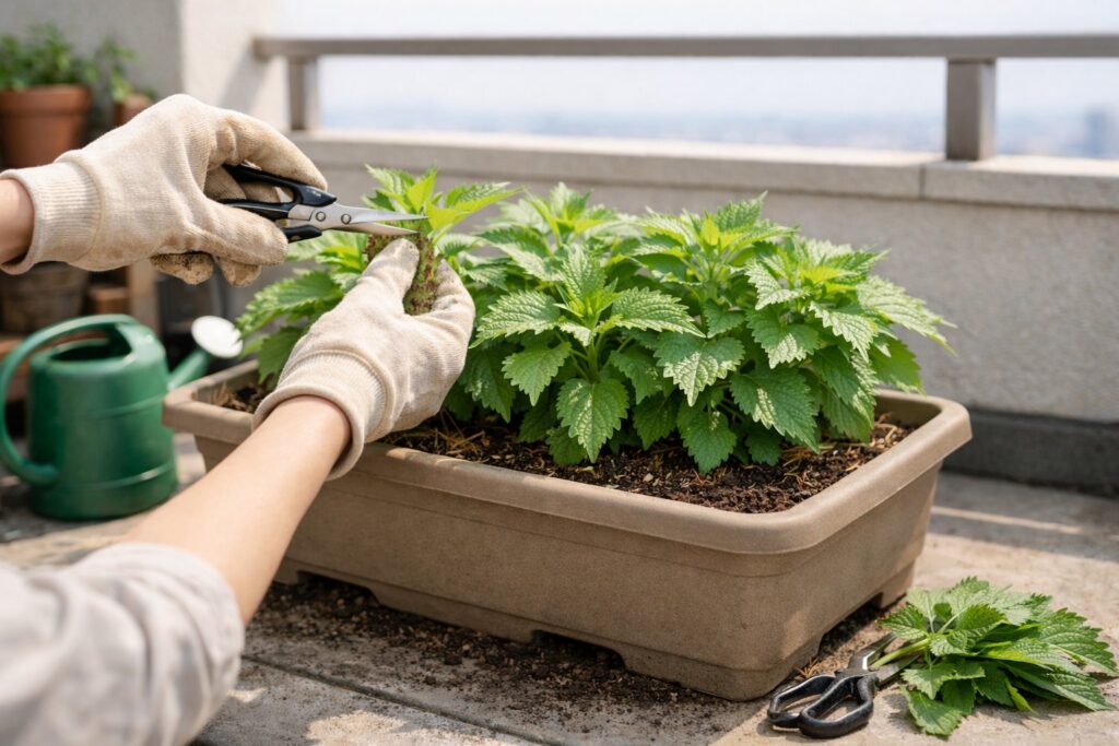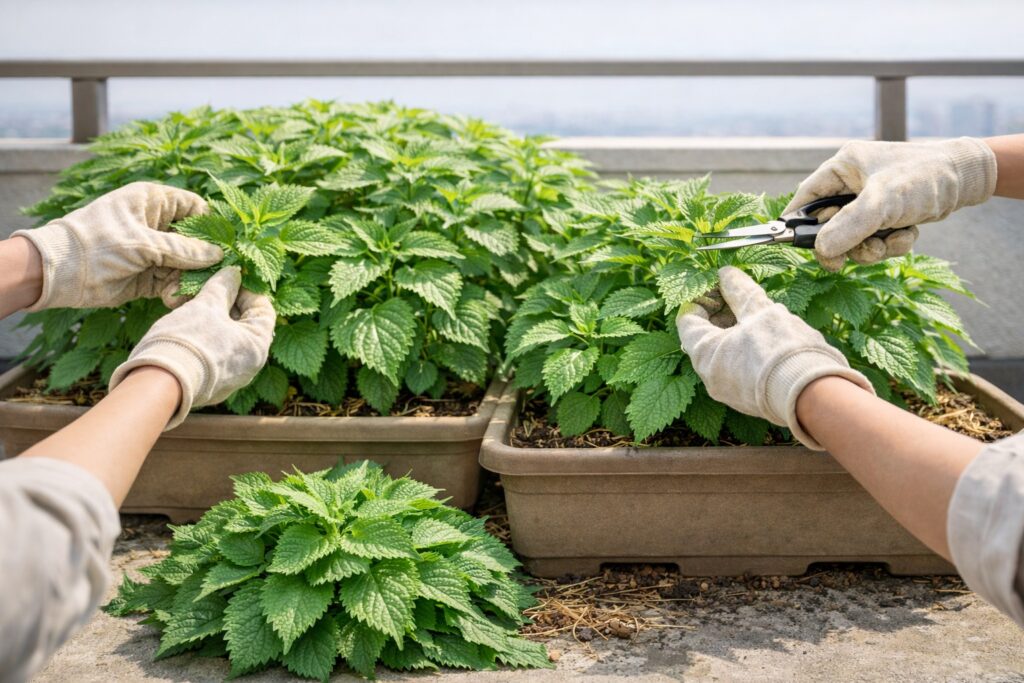 収穫量を増やす最大のポイントは「摘心(てきしん)」です。株の先端を摘み取ることで枝が増え、葉が次々に育つようになります。収穫するときは上の葉から少しずつ取り、葉を残しながら育てると長く収穫できます。