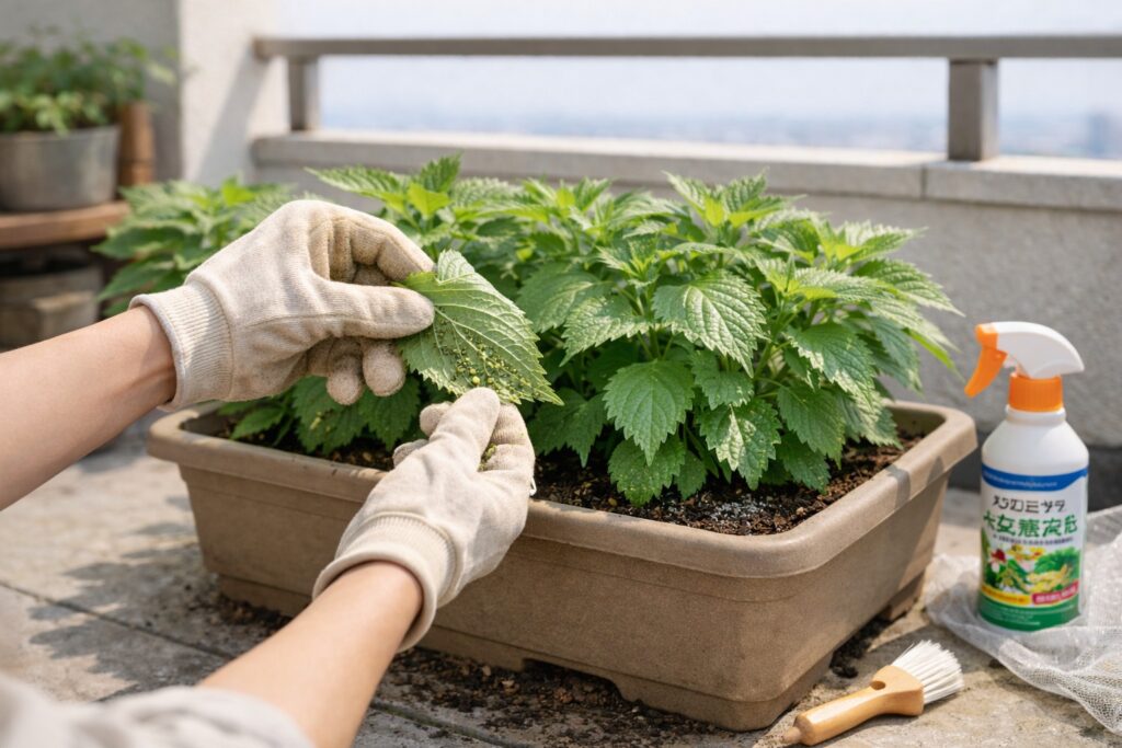 大葉は害虫がつきやすいため、早めの対策が大切です。日頃から葉の裏までよく観察して、異変があればすぐに対応しましょう。